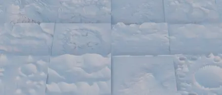 砂漠、山脈、メサ、渓谷、月、クレーター、海洋、単一の山、砂丘、島々、湖、川、(大規模、メサ構造、岩場、山を擁する湖)。