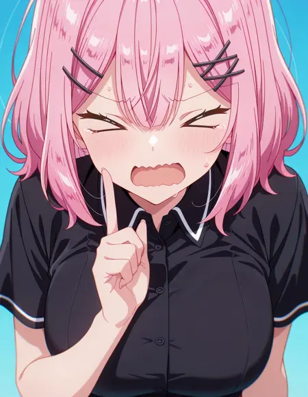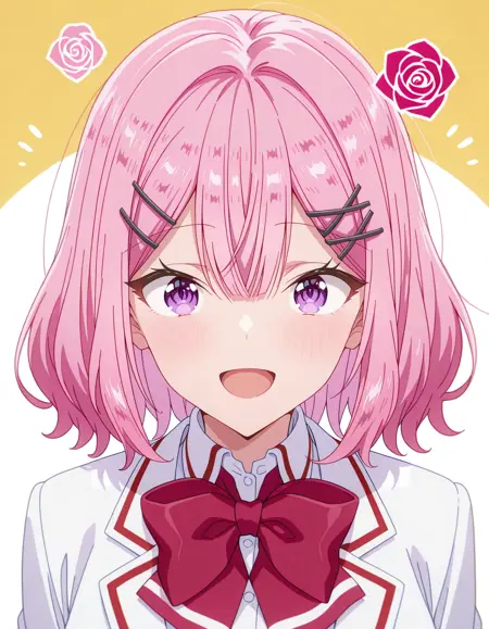 mai_renako_amaori,short_hair,pink_hair,hairclip,x_hair_ornament,purple_eyes,bow,school_uniform,jacket,black_jacket