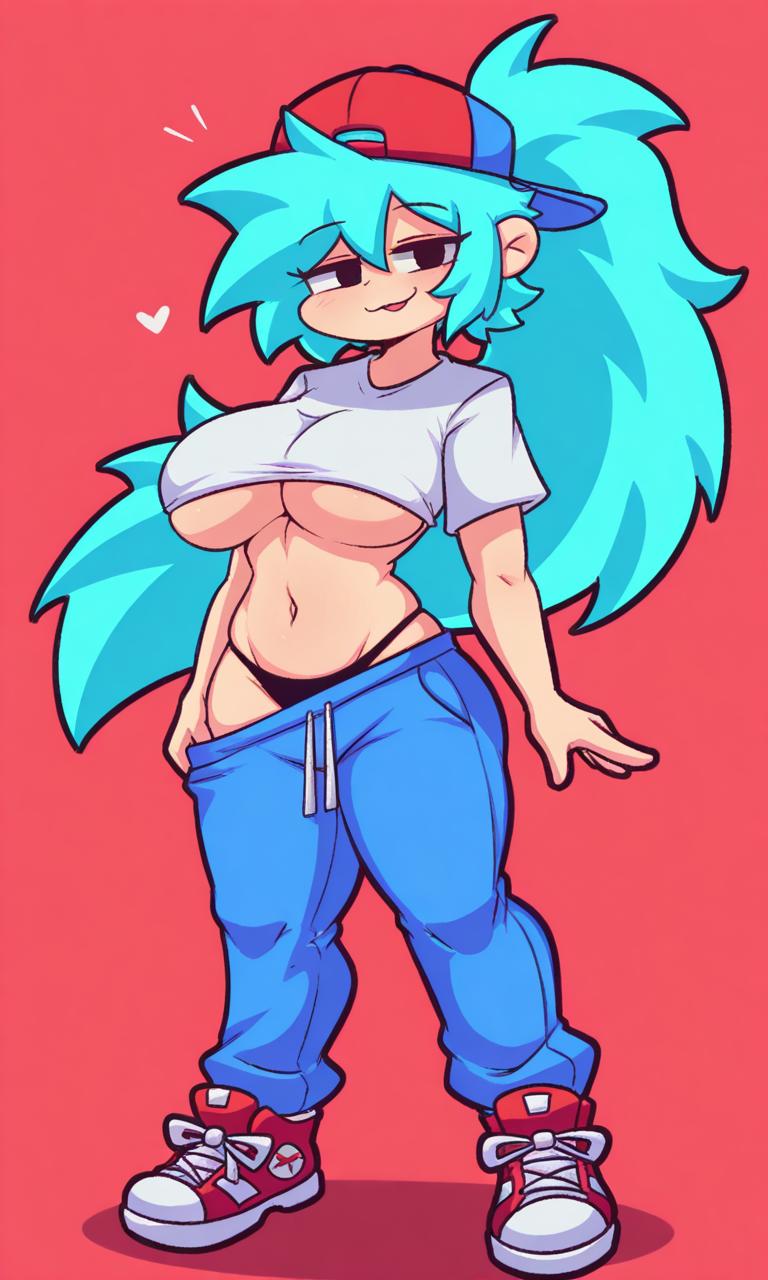 FunnyBF,1girl,aqua hair,cyan hair,spiky hair,very long hair,ponytail,breasts,underboob, large breasts,navel,white shirt, sneakers, red headwear,black panties,shoes,red footwear,blue pants,white shoelaces,black eyes,backwards hat,blue brim