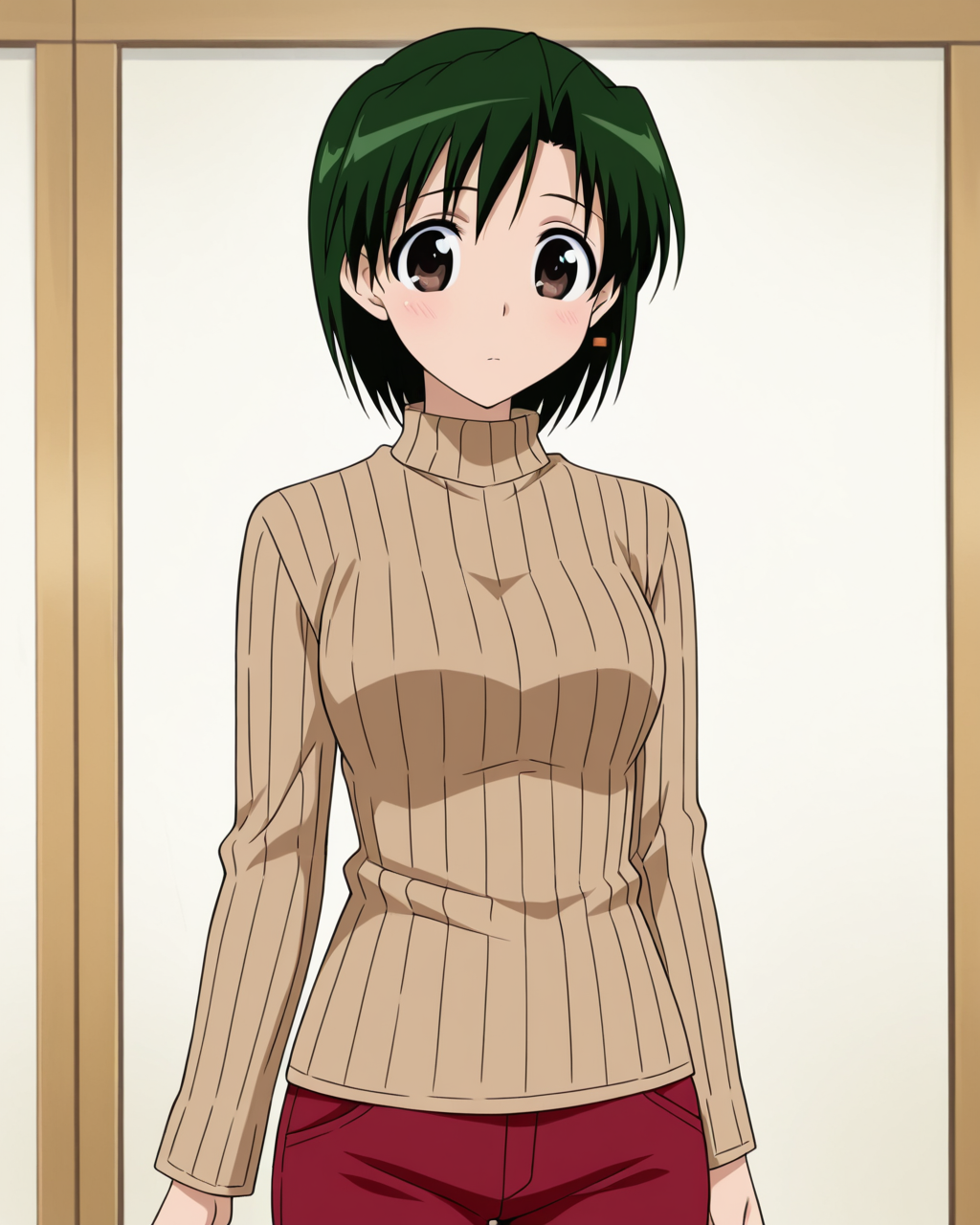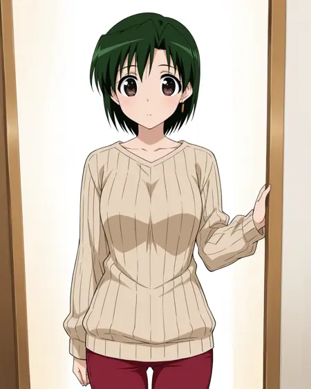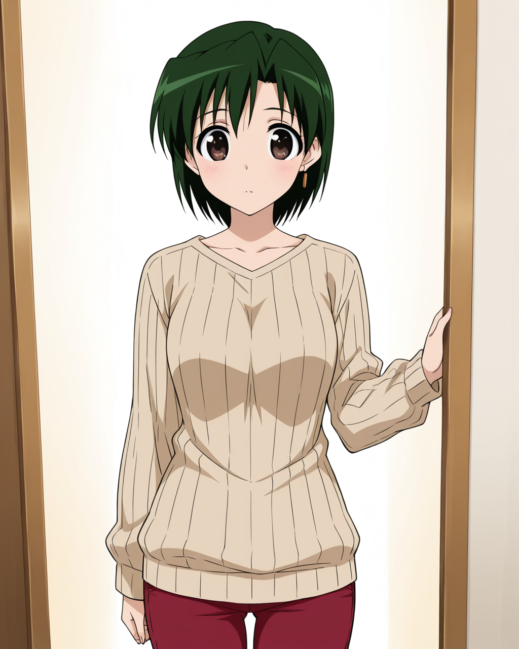 Karen Ichijo, Karen, 진한 갈색 눈, 녹색 머리, 1girl, 솔로, 단발, 바지, 솔로, 빨간 바지, 단발, 긴 소매, 스웨터, 홈이 들어간 스웨터, 긴 소매