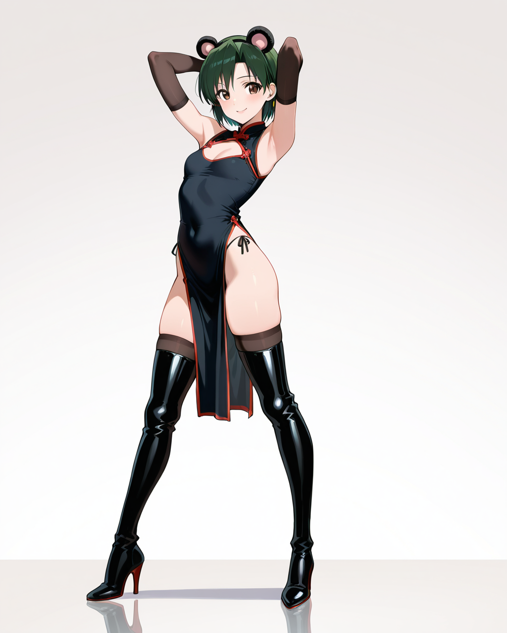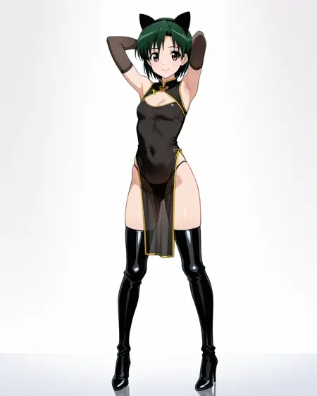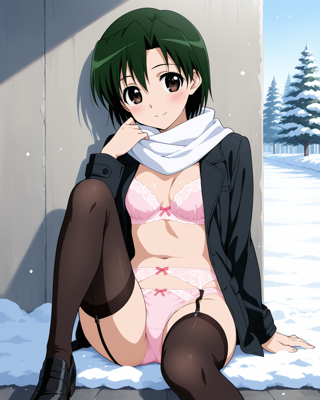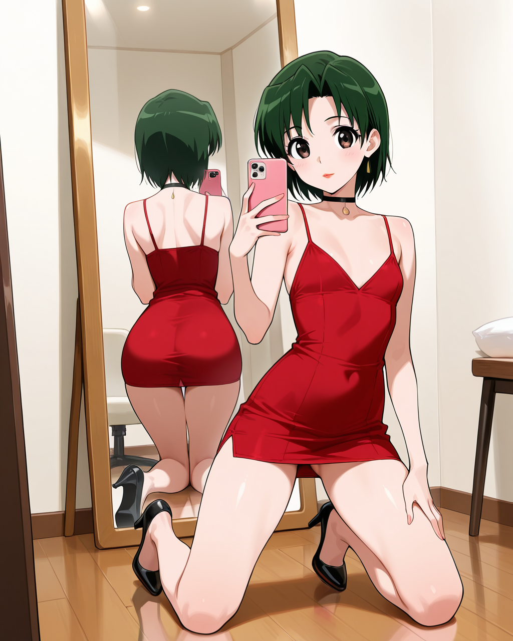 Karen Ichijo, Karen, 진한 갈색 눈, 녹색 머리, 1girl, 솔로, 단발, 바지, 솔로, 빨간 바지, 단발, 긴 소매, 스웨터, 홈이 들어간 스웨터, 긴 소매