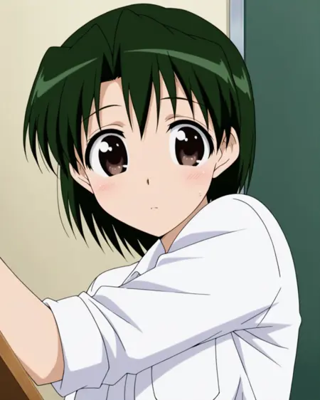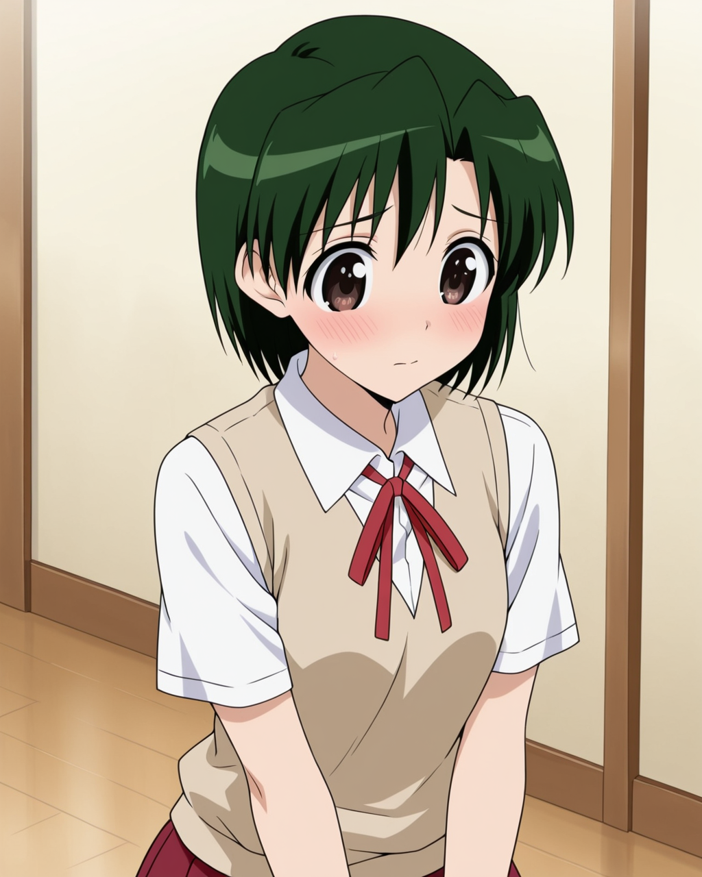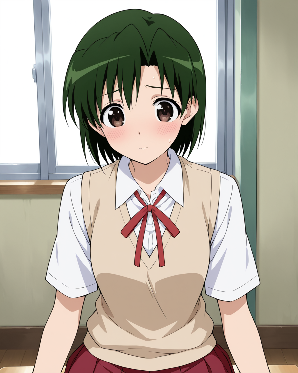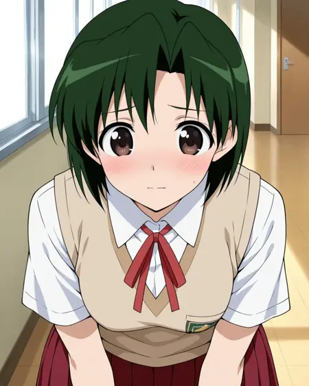 Karen Ichijo, Karen, 진한 갈색 눈, 녹색 머리, 1girl, 솔로, 학교 유니폼, 단발, 조끼, 셔츠, 짧은 소매, 흰 셔츠, 뺨빛, 리본, 빨간 리본, 목 리본, 실내, 칼라 있는 셔츠, 입 다문, 스웨터 조끼, 치마, 빨간 치마, 접힌 치마