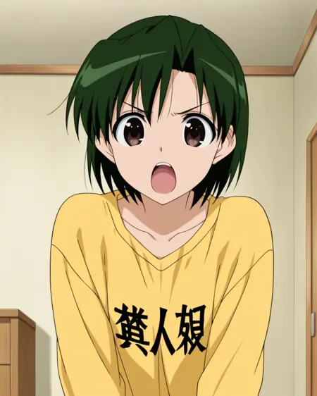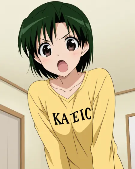 Karen Ichijo, Karen, 진한 갈색 눈, 녹색 머리, 1girl, 솔로, 단발, 솔로, 입 벌린, 긴 소매, 셔츠, 화난, 실내, 상반신, :o, 옷에 쓰인 글자, 노랑 셔츠, 야단치는, V자 모양 eyebrows, 보는 이를 바라봄