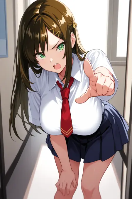 Add "hairclip, hair ribbon, white shirt, collared shirt, short sleeves, red necktie, dark blue skirt, pleated skirt" for her school uniform.