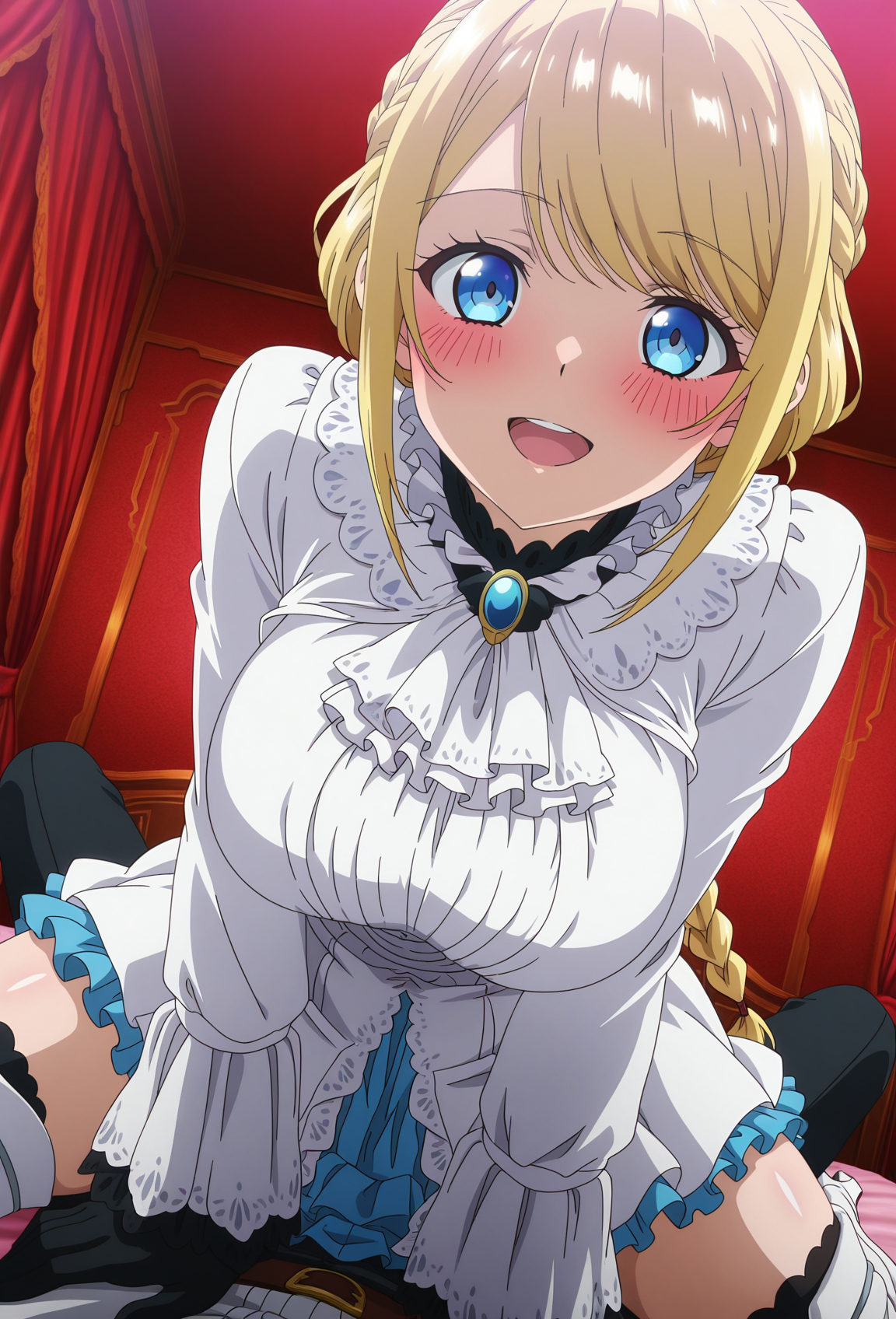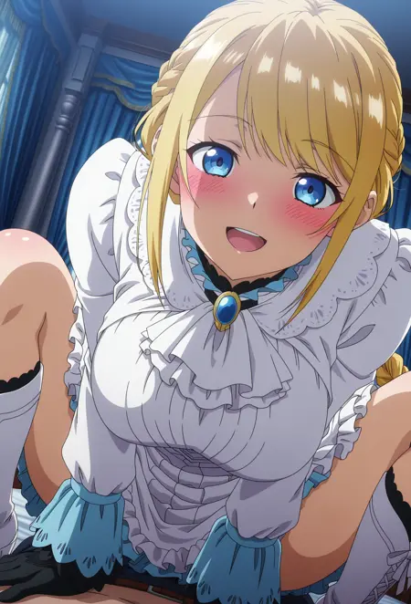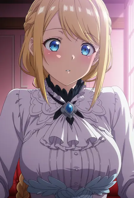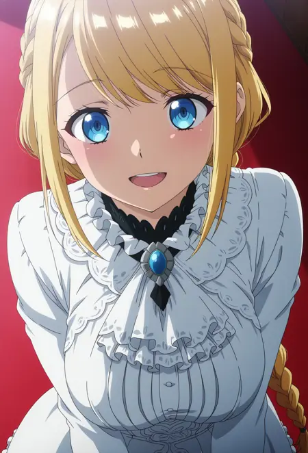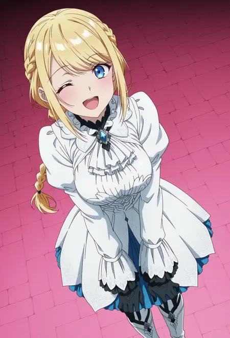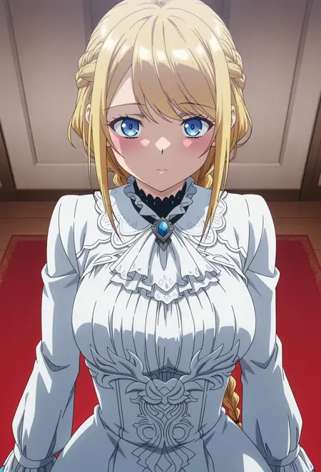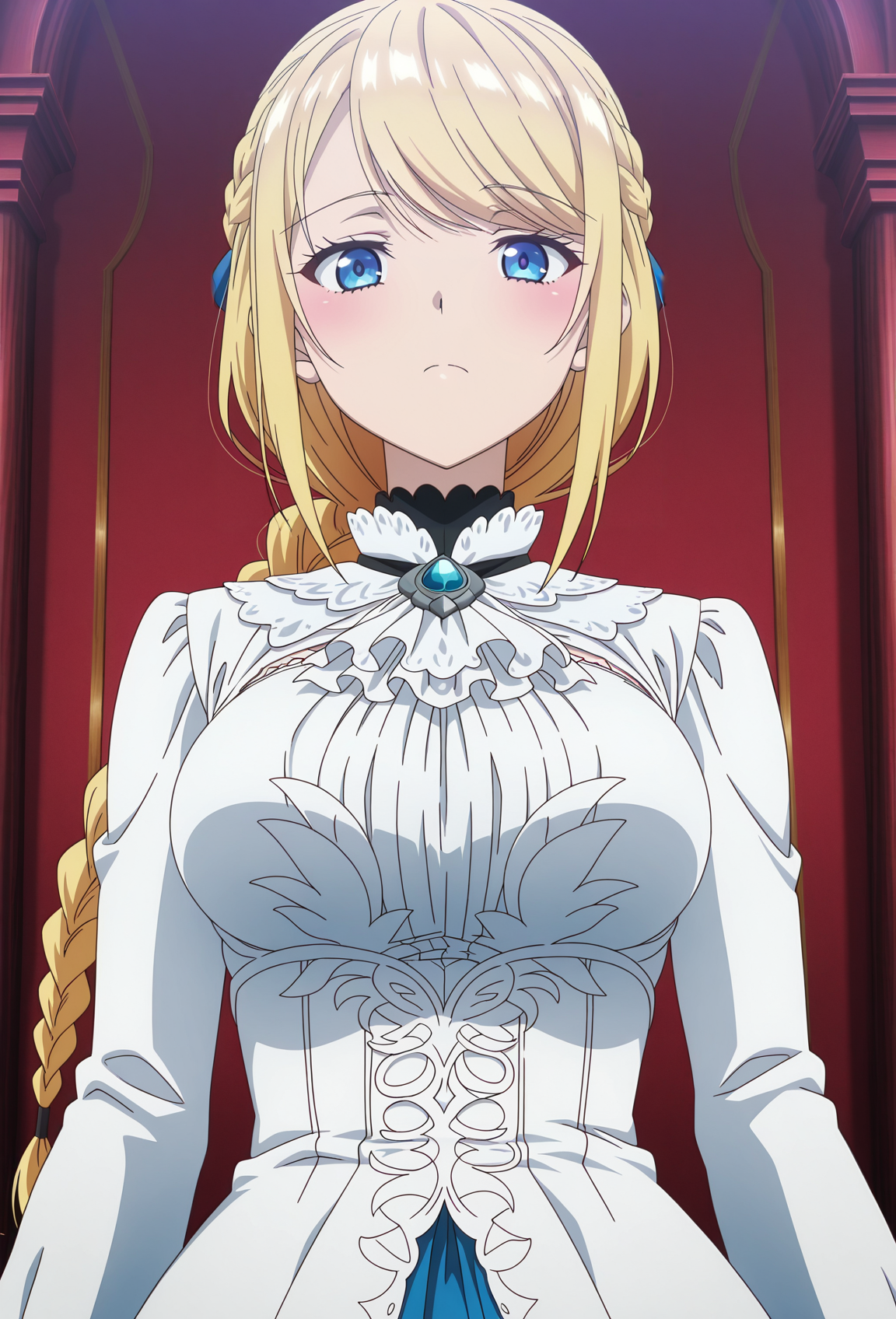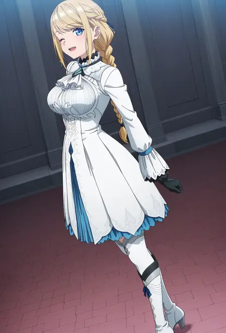 val_(ge), 1girl, solo, large breasts, blonde hair, braid, low ponytail, single braid ponytail, sidelocks, swept bangs, blue eyes, white dress, long sleeves, frills, white ascot, white footwear, white kneeboots, white high heels,