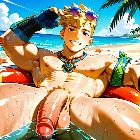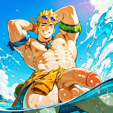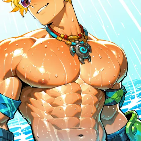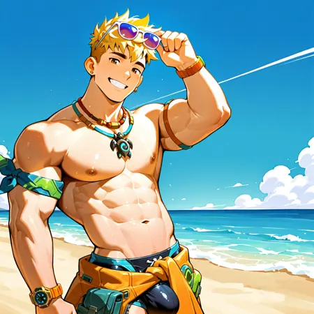 <lora:WUYANG_POOLSIDE:1> wuyang_poolside, 短发, 男性焦点, 1个男孩, 珠宝, 肌肉发达, 金发, 肌肉男性, 赤裸上身, 单人, 项链, 胸肌, 腹肌, 微笑, 乳头, 眼镜戴在头上, 太阳镜, bara, 肚脐, 臂带, 户外, 男性泳装, 看着观众, 耳环