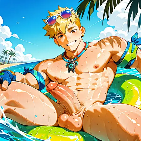 <lora:WUYANG_POOLSIDE:1> wuyang_poolside, short hair, male focus, 1boy, jewelry, muscular, blonde hair, muscular male, topless male, solo, necklace, pectorals, abs, smile, nipples, eyewear on head, sunglasses, bara, navel, armband, outdoors, male swimwear, looking at viewer, earrings