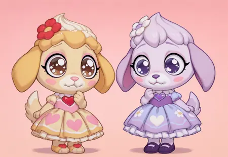 | 训练词汇 | (anthro, furry, furry female), crepe gugu, dog, (yellow skin, yellow fur, bodyfur), yellow dog ears, white muzzle marking, pink nose, big eyes, brown eyes, eyelashes, makeup, eye makeup, pale pink eyeshadow, blush stickers, (light pink and yellow dress), red heart-shaped brooch, white frilled collar, pink bodice, light yellow and white (long attached small heart_print layered dress_skirt), small red heart_print, (small red_heart print on long attached layered dress_skirt), red flower, hair_flower, flower hair ornament, food-themed hair ornament, food on head, yellow and light yellow striped whipped cream hair ornament, dark yellow shoes 已复制! (anthro, furry, furry female), vanilla gigi, dog, (light purple skin, light purple fur, bodyfur), purple dog ears, white muzzle marking, dark purple nose, big eyes, dark blue eyes, eyelashes, makeup, eye makeup, pale cream eyeshadow, blush stickers, (light purple and light blue dress), light blue heart-shaped brooch, white frilled collar, purple bodice, light purple and white (long attached small heart_print layered dress_skirt), small light blue heart_print, (small light blue_heart print on long attached layered dress_skirt), white flower, hair_flower, flower hair ornament, food-themed hair ornament, food on head, purple and light purple striped whipped cream hair ornament, dark purple shoes 已复制! |