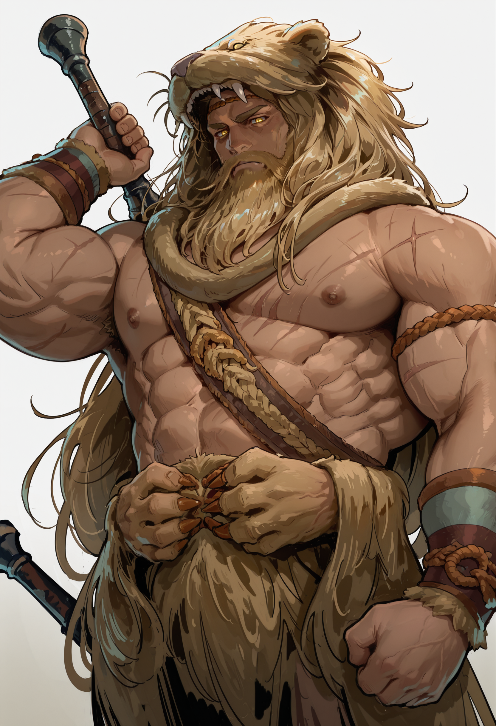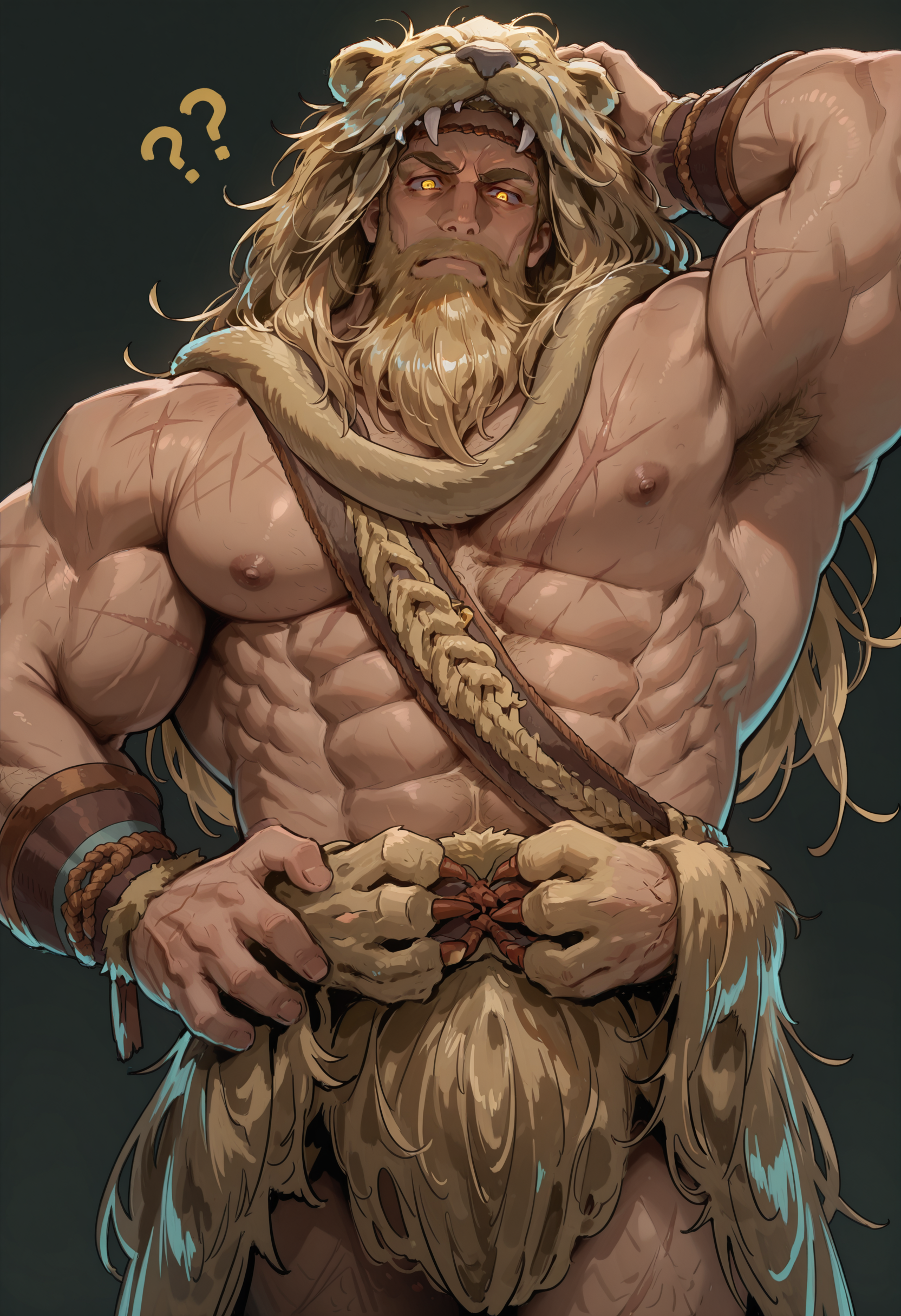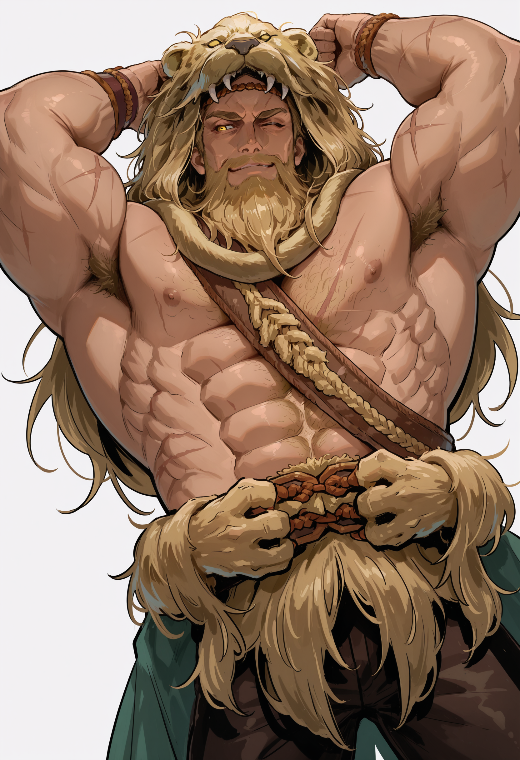 補助プロンプト: 長いひげ、顔の毛、金髪、黄色い目、ライオンの Hood、皮のベルト、胸のベルト、傷