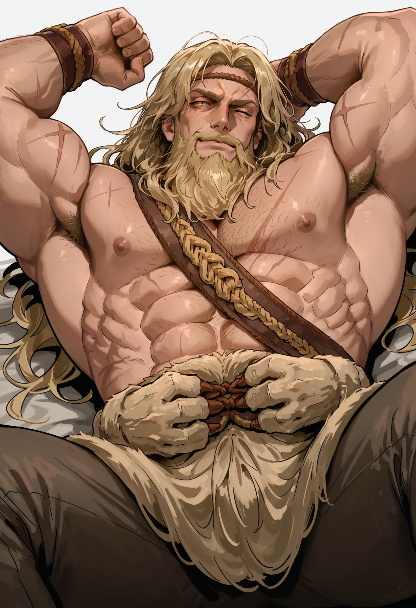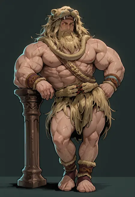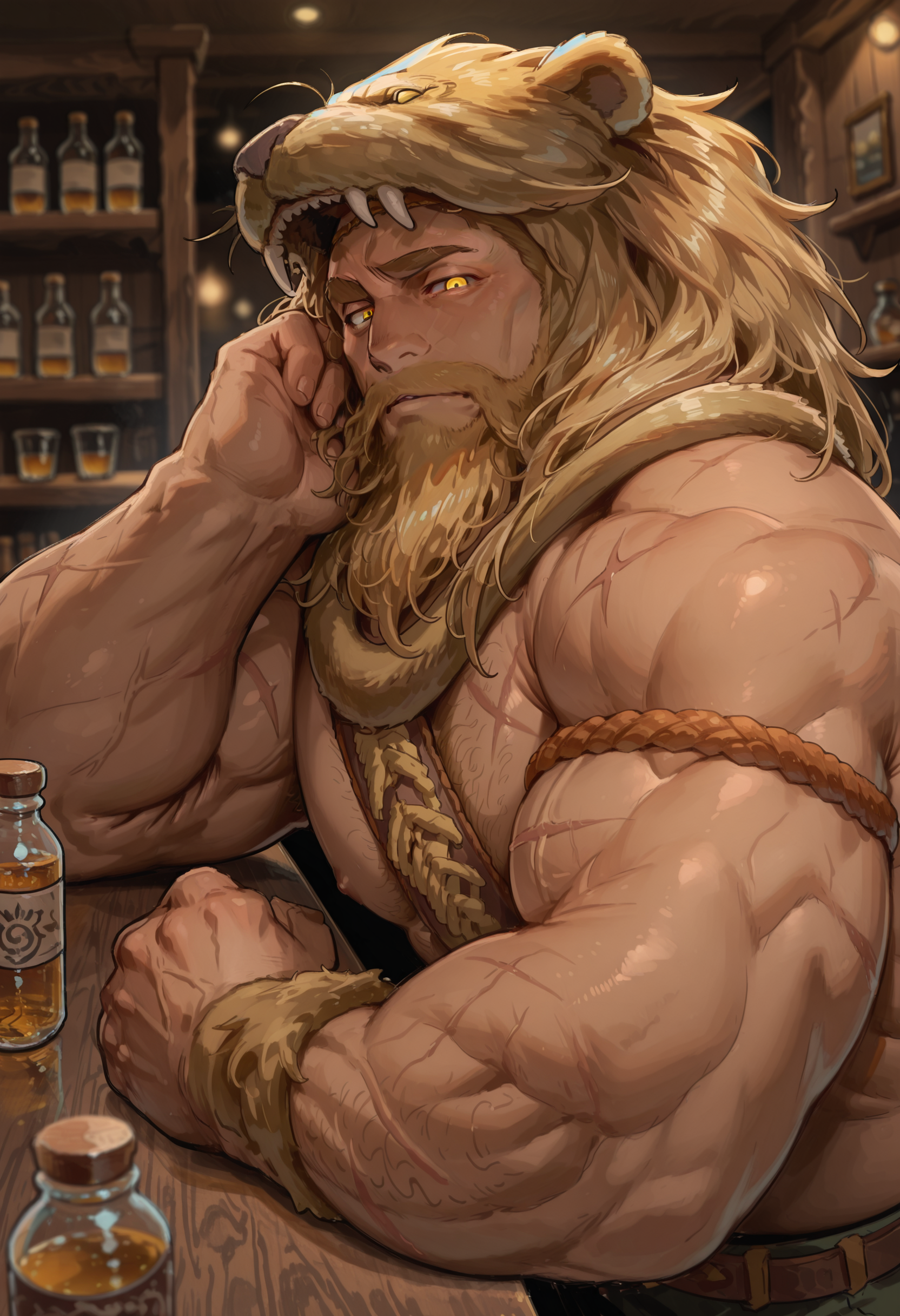 補助プロンプト: 長いひげ、顔の毛、金髪、黄色い目、ライオンの Hood、皮のベルト、胸のベルト、傷