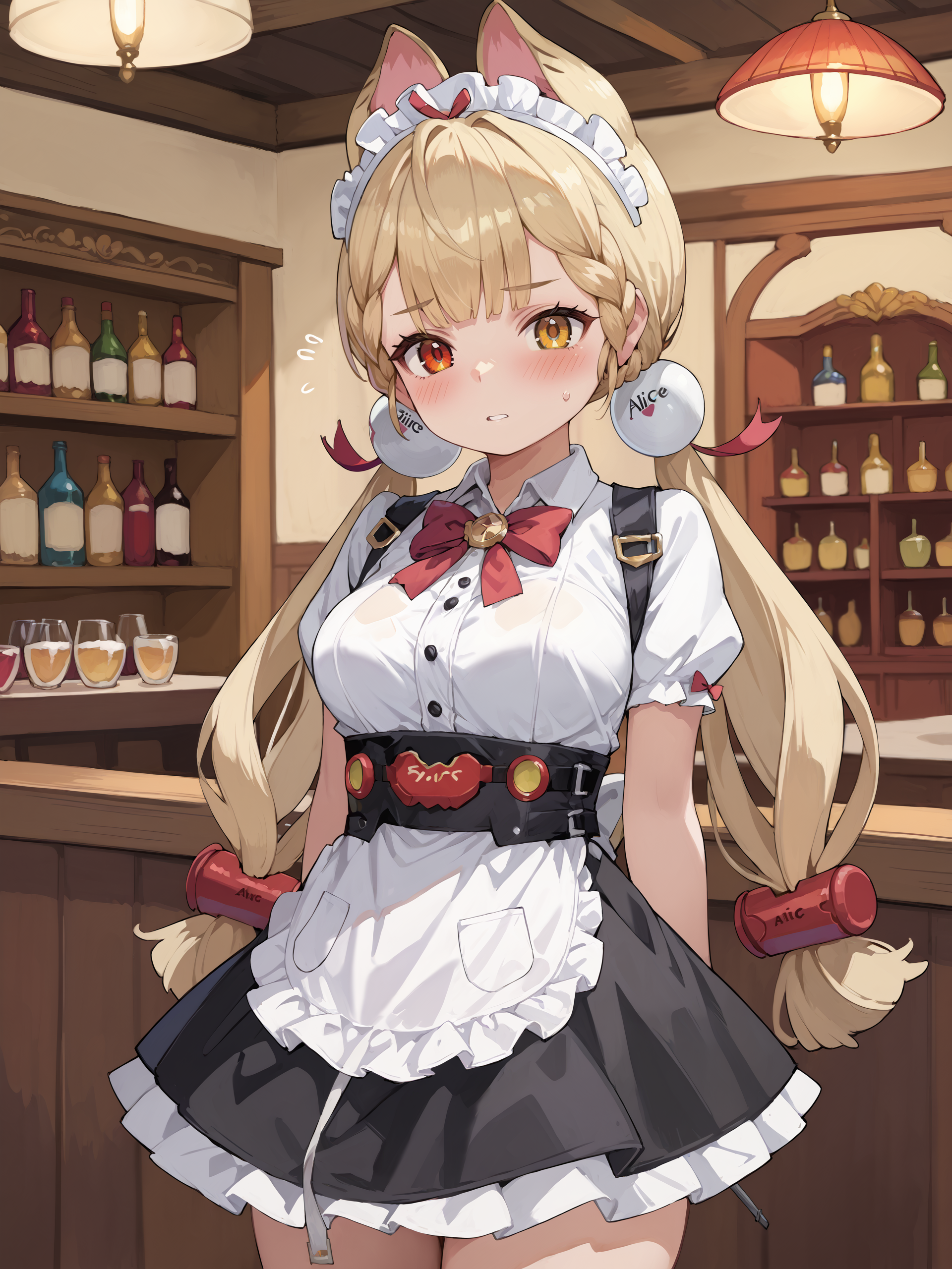 Additional prompts for Default Costume: heterochromia, braided bangs, twintails, hair bobbles, white collared shirt, ribbon-trimmed sleeves, two-tone bowtie, chest harness, fingerless gloves, utility belt, high-waist pleated skirt, print pantyhose, high tops