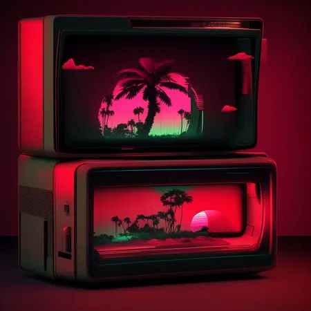 - おしゃれな日没背景を持つレトロなテレビや家電製品を生成