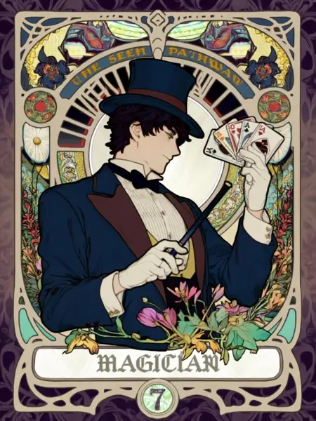 lotm,塔罗牌,塔罗,邓恩·史密斯站在彩色玻璃窗前,短发向后梳拢,身穿黑色外套、背心与领带,一手持烟斗,另一手持手杖,背景为精细图案与鲜艳色彩,图像下方显示其姓名“dunn smith”,lotm