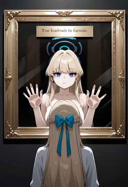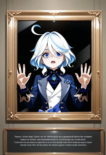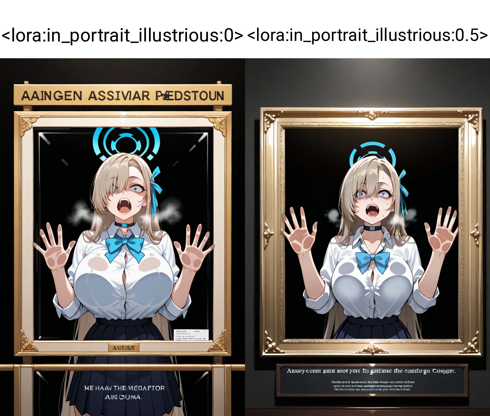 in_portrait, inprtrt, portrait, 1girl, against glass, black background, indoors, paint frame, museum, description, panel, label, english text, <lora:in_portrait_illustrious:0.7>