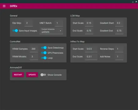 DiffEx는 AnimateDiff CLI Prompt Travel을 위한 간편한 데스크톱 UI입니다. 대부분의 작업을 자동으로 처리하여 애니메이션을 만드는 데 필요한 복잡성과 수작업을 크게 줄여줍니다. 시작하기 위한 자세한 readme 파일이 포함되어 있습니다!