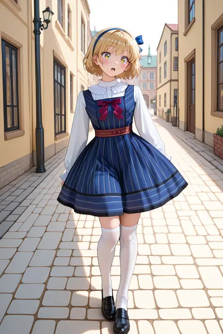 縦ストライプのジャンパースカートにフリル袖のブラウスを合わせ、ショートケープ(capelet)を羽織った、上品でクラシカルな装いです。