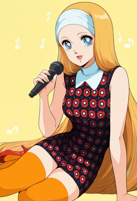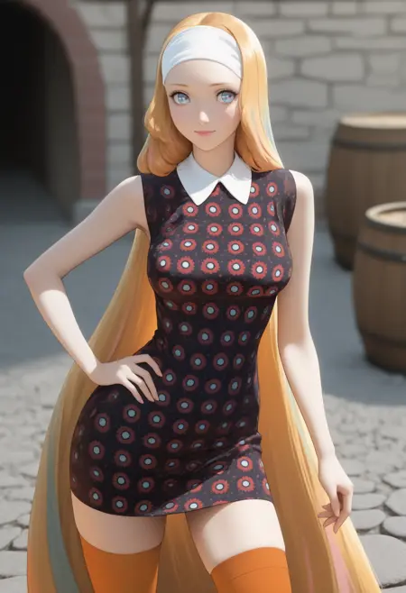 默认外观: 金发,超长发,条纹发,白色发带,蓝眼睛,多色眼睛,有领连衣裙,黑色连衣裙,中等胸部,无袖,花卉图案连衣裙,白色手套,红色腰带,腰带扣,短裙,橙色过膝袜