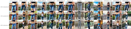 참고: 일부 체크포인트에서는 색상이 청록계열로 나타날 수 있습니다. 완전한 제어를 위해 프롬프트에서 색상 설정(예: 검정/흰색 데님)하고 부정적 키워드(청록색 데님)를 사용하세요.