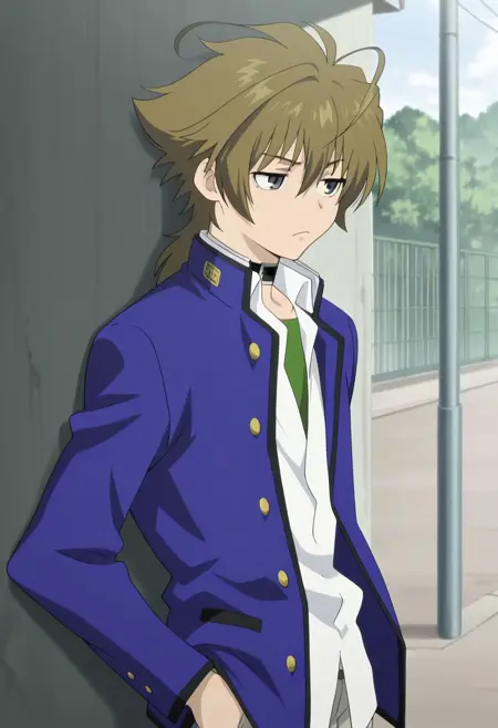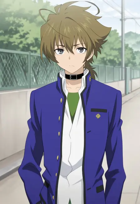 1소년, 남성 중심, 단독, 회색 눈, 갈색 머리, 학교 유니폼, 검은 목걸이, 흰 셔츠, 칼라 셔츠, 부분적으로 단추 풀림, 가쿠란, 녹색 안셔츠, 파란 재킷, 열린 재킷, 파란 바지, 신발, 검은 신발,