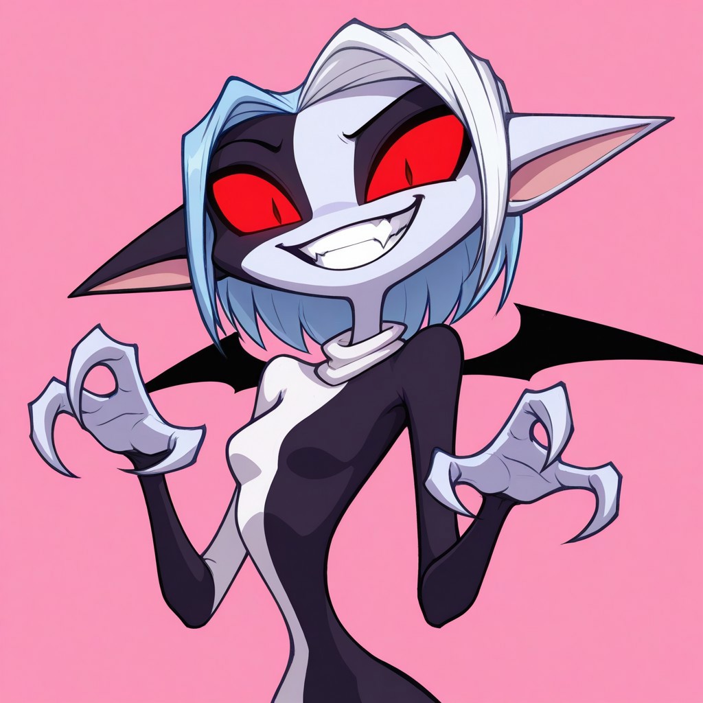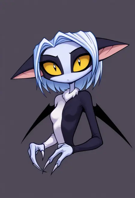 wisp_dk, 1girl, solo, wings, animal ears, colored skin, blue hair, white hair, bat wings, small breasts, furry, furry female, pointy ears, claws, bat ears, black wings,