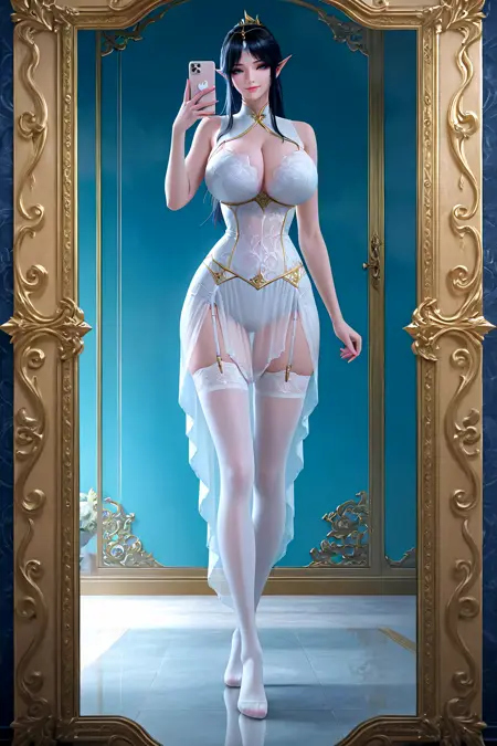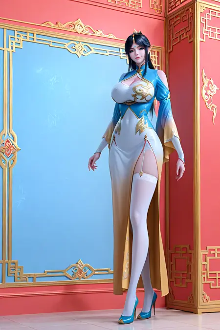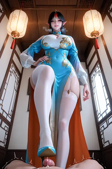 fengqinger, hair ornament, black hair, blue eyes, pointy ears, long hair, facial mark, forehead mark, qipao, china dress, clothing cutout, cleavage cutout, white thighhighs