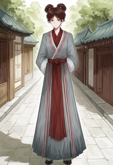 grey hanfu, wide sleeves, red belt, brown hooves