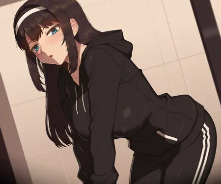 sena, blue eyes, brown hair, long hair, sidelocks, white hairband,