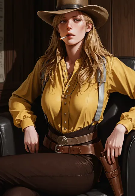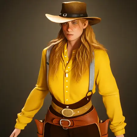 카우보이 모자, 노란 셔츠, 갈색 바지, 팔찌, 벨트, 총집, 목걸이,