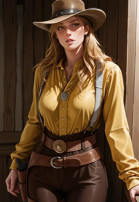 カウボーイハット、黄色のシャツ、茶色のズボン、サスペンダー、ベルト、ホルスター、ネックレス、
