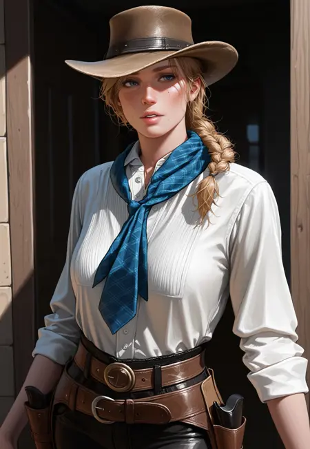 카우보이 모자, 파란 넥커치프, 흰 셔츠, 검은 바지, 벨트, 총집,