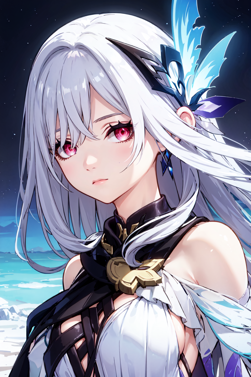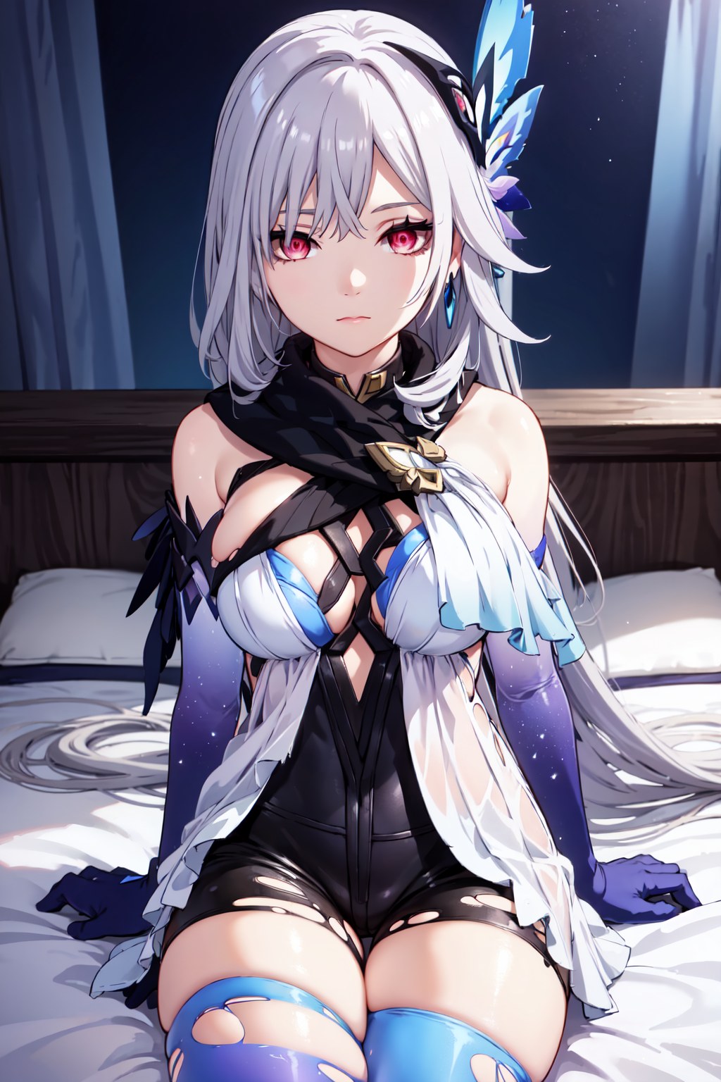 skirk, 1girl, long hair, gloves, breasts, jewelry, bangs, dress, bare shoulders, elbow gloves, looking at viewer, blue gloves, closed mouth, hair ornament, earrings, very long hair, medium breasts, cowboy shot, grey hair, hair between eyes, red eyes, black shorts