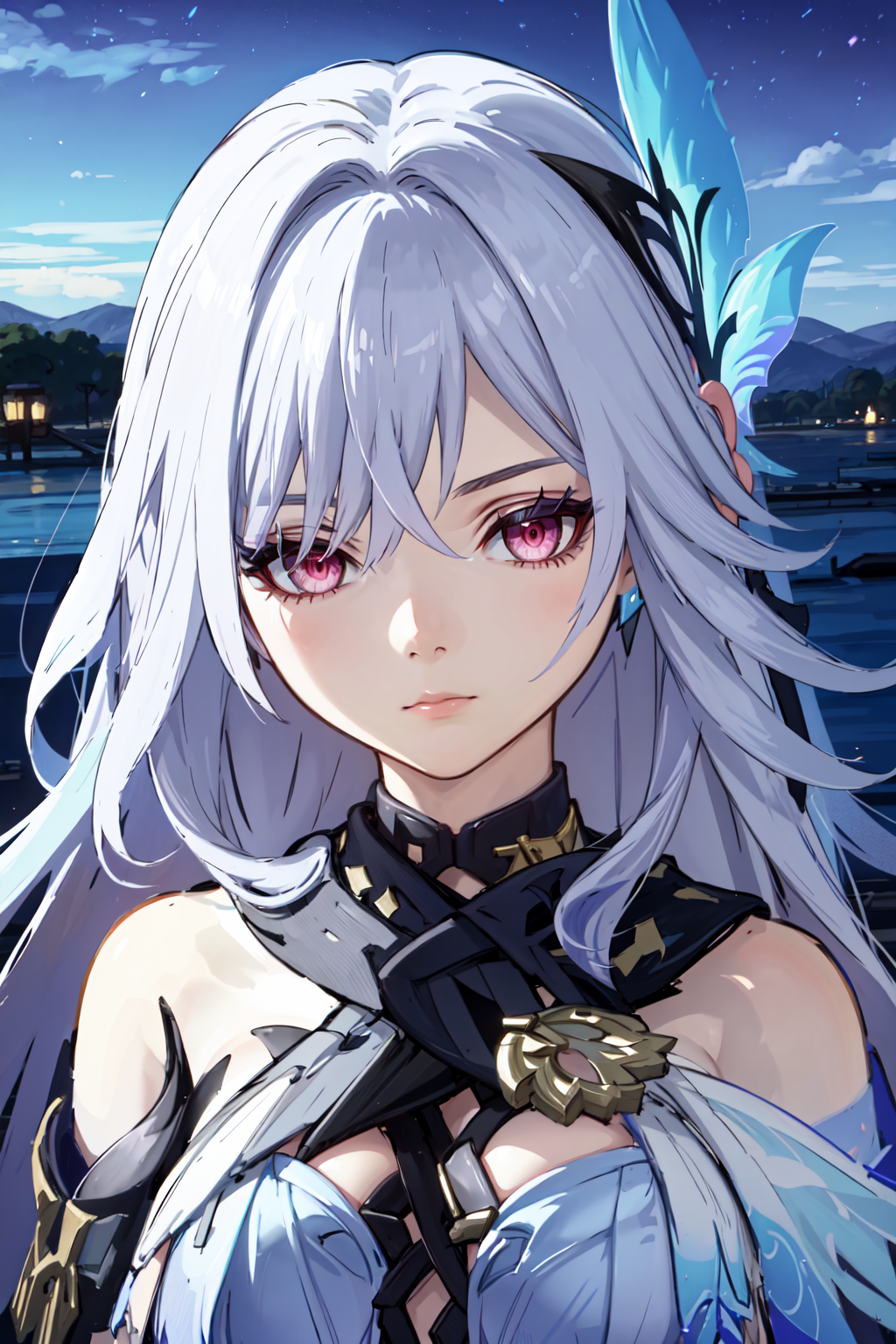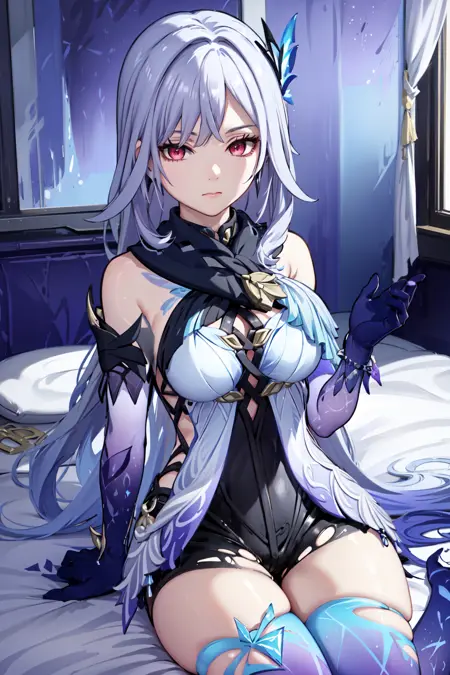 skirk, 1girl, long hair, gloves, breasts, jewelry, bangs, dress, bare shoulders, elbow gloves, looking at viewer, blue gloves, closed mouth, hair ornament, earrings, very long hair, medium breasts, cowboy shot, grey hair, hair between eyes, red eyes, black shorts