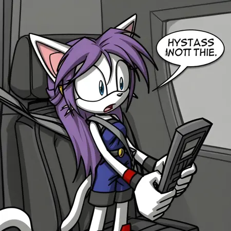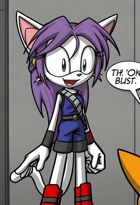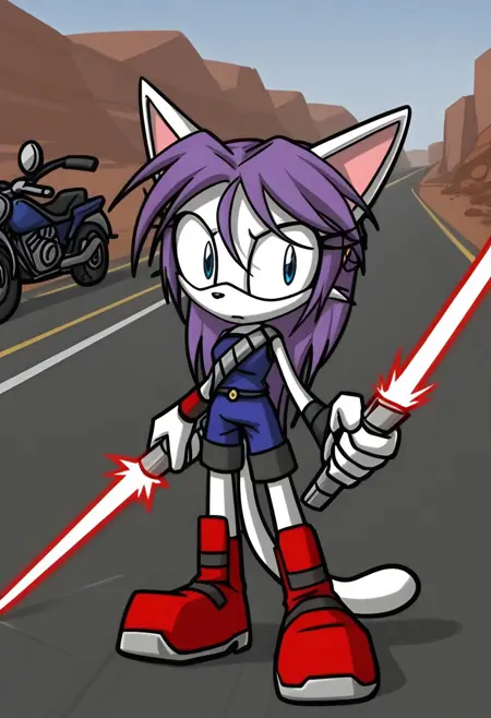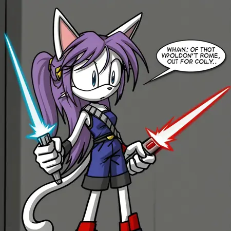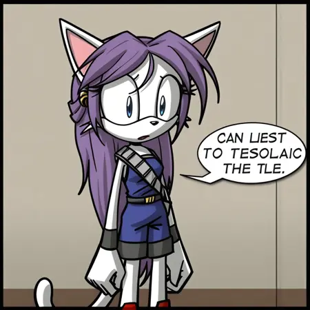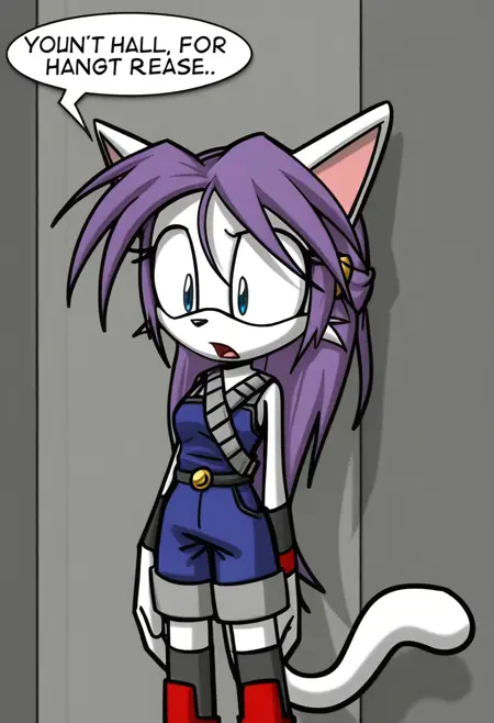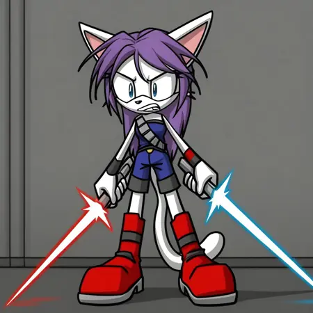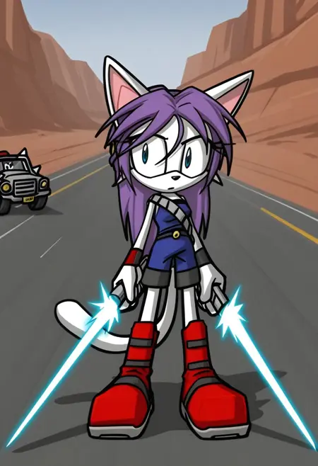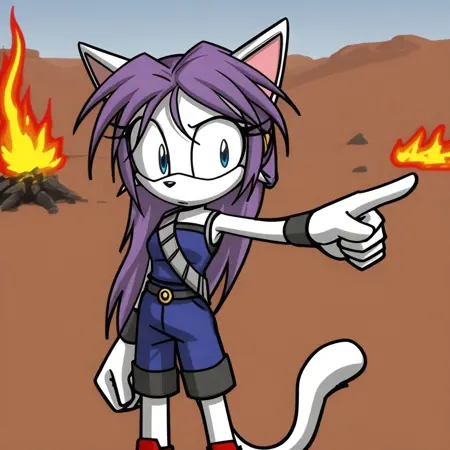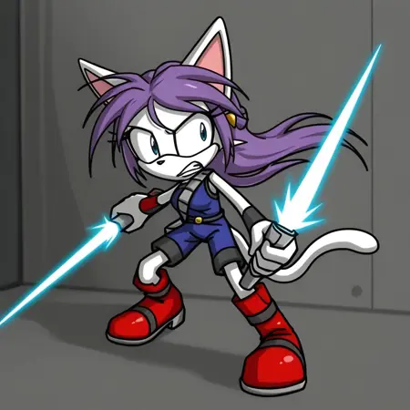 wldfr_en, 1girl, solo, purple hair, animal ears, long hair, blue eyes, furry, cat ears, tail, shorts, furry female, cat tail, sonic_the_hedgehog,