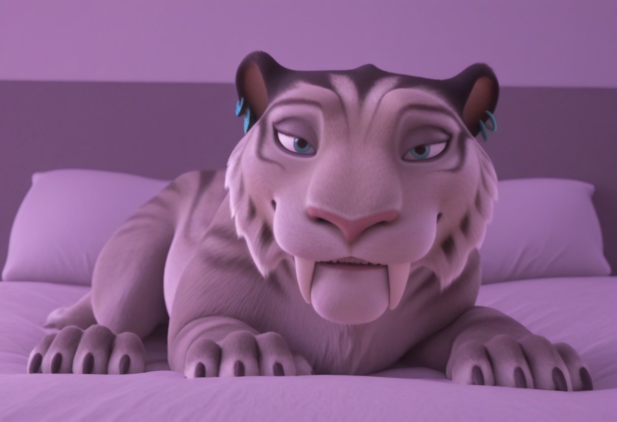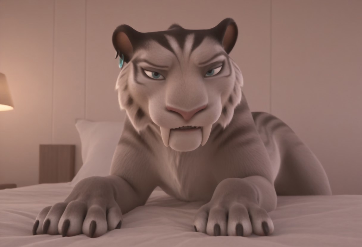 shiraice, sabertooth tiger, feline, furry, female, earrings, blue eyes, pink nose, gray fur, black round ears, fangs, 3D, black stripes,