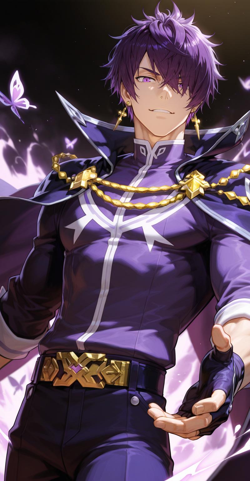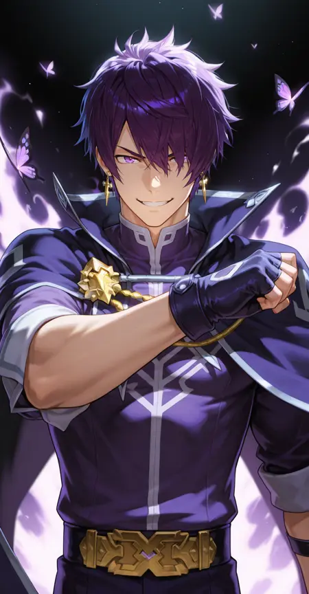 デフォルトの衣装: 濃い紫色のマント、紫のシャツ、紫のズボン、太ももブーツ、十字型のイヤリング