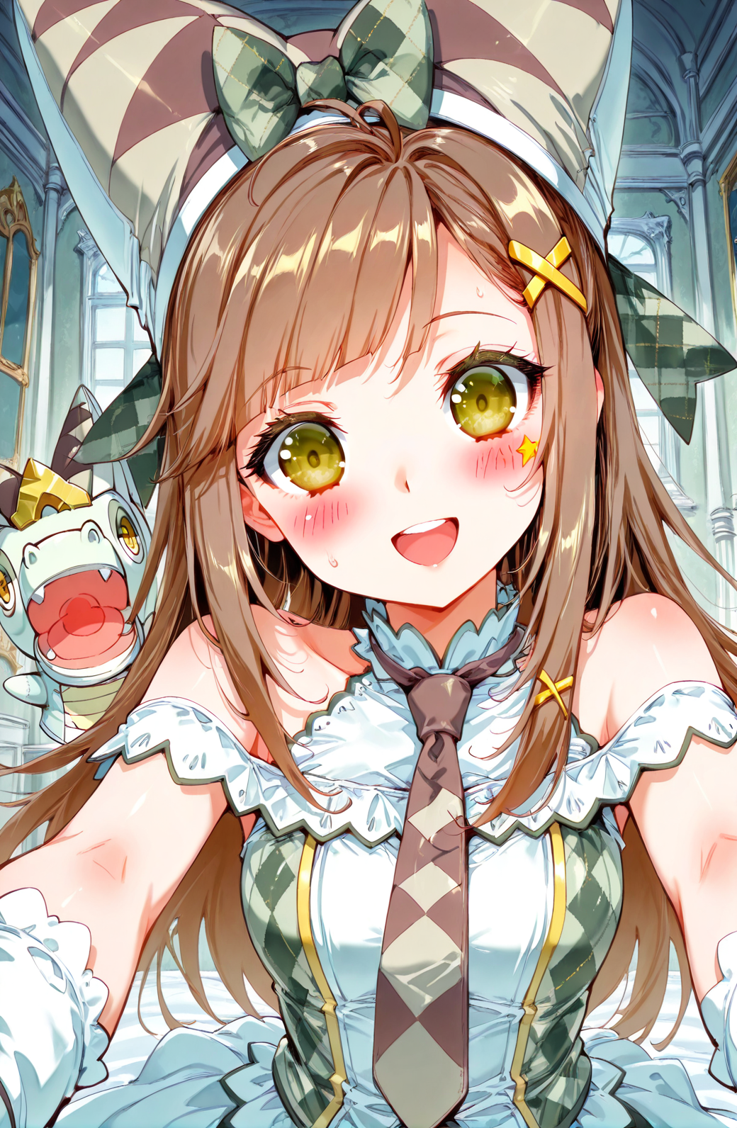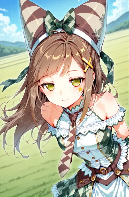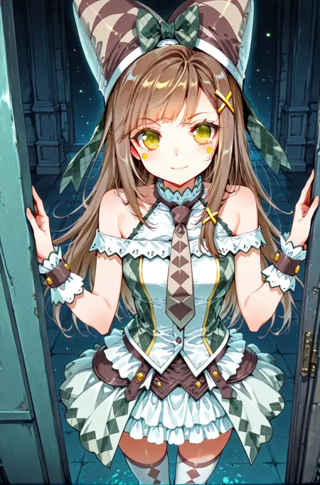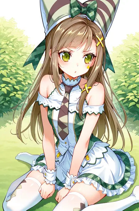 | 학습된 단어 | Meiki, 1girl, solo, green eyes, long hair, brown hair, light brown hair, asymmetrical bangs, hair between eyes, long sidelocks, hat, plaid hat, green hat, plaid bow, green bow, hair ornament, hairclip, yellow hairclip, cross hairclip, facial mark, star mark,복사됨! Meiki_outfit, sleeveless blouse, plaid blouse, white front panel, light green trim, front buttons, halter neckline, bare shoulders, waist ruffles, necktie, plaid necktie, white skirt, short skirt, detached cuffs, white cuffs, buttoned cuffs, white thighhighs socks, opaque thighhighs, v-cut thighhighs, zigzag pattern,puppet, dragon puppet,복사됨! |