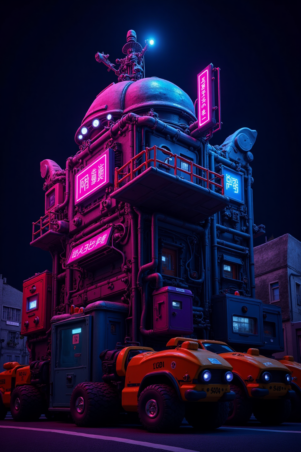 ネオンライト効果、フランキーが工作する、ネオンで輝く機械、ロボットのネオン部品、大胆な色のブロック、未来感ある光の動き、船の製作に用いるネオンフレーム。