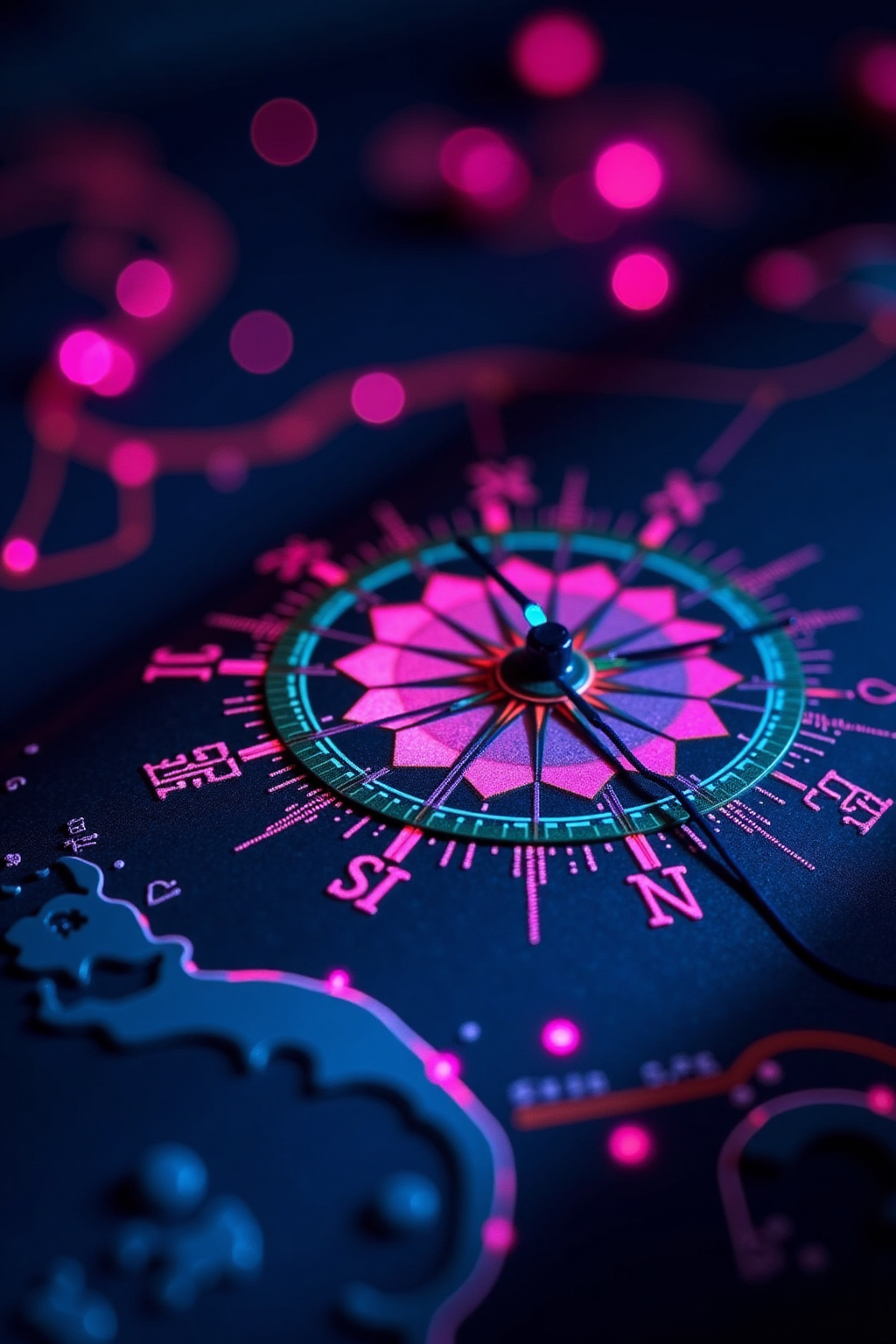 ネオンライト効果、ナミが航海する、ネオンで輝く天候パターン、発光するコンパス、海をテーマにしたネオンカラー、光で包まれた地図、天体の光のアクセント。