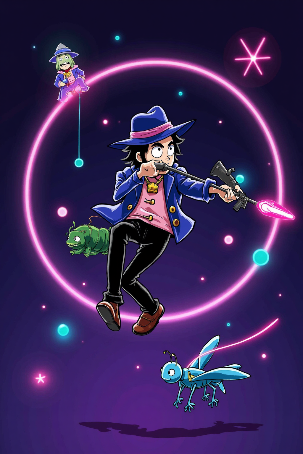 ネオンライト効果、ウソップが狙撃する、ネオンで動力化されたスリングショット、光の軌跡を残す弾丸、遊び心あるネオン形状、バッタのようなネオンジャンプ。