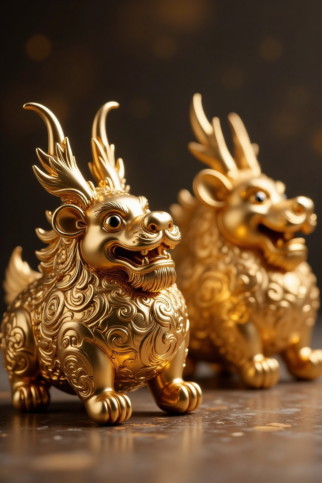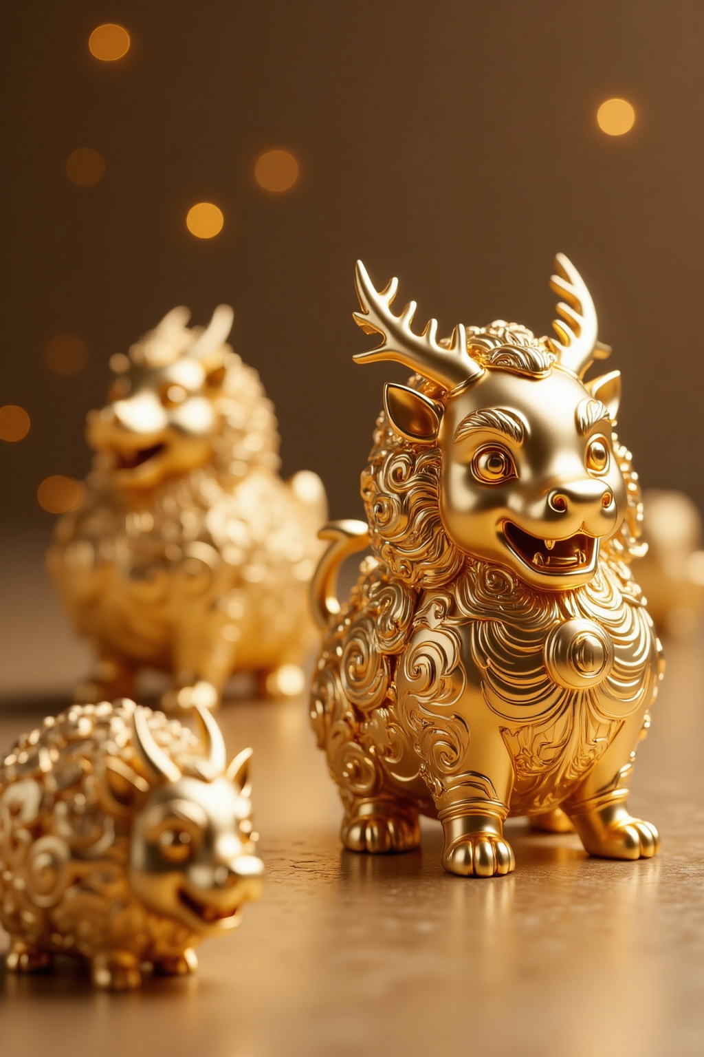 3. 金の十二支動物彫刻、宝石のように輝く目、繊細な彫刻、柔らかなアンビエントライト、豪華さと優雅さを強調。