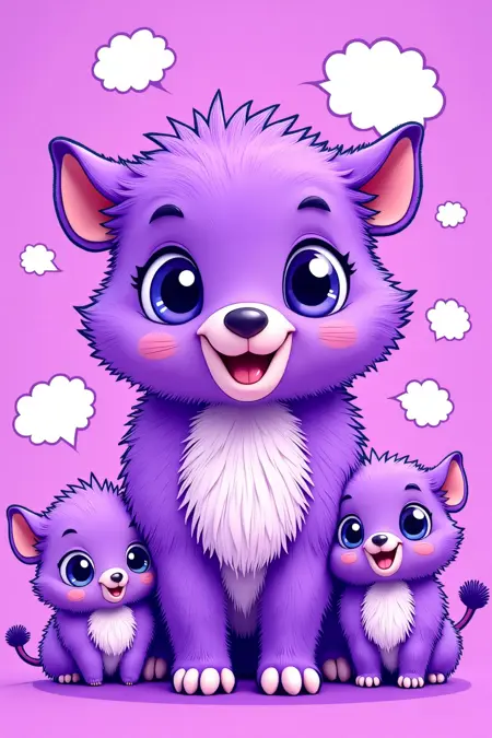 紫色のかわいらしいカートーン動物、ポップアートスタイル、太い輪郭、明るいパープルと補色、コミックブックの要素、会話バルーン、エネルギッシュなムード。