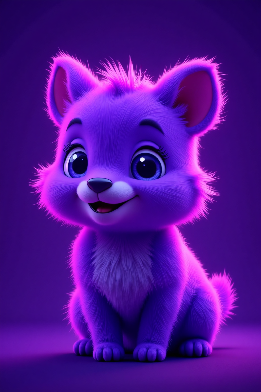 紫色のかわいらしいカートーン動物、ネオンライトスタイル、発光する輪郭、濃いパープルの背景、未来感、ダイナミックな立ち姿、サイバーパンクの要素。