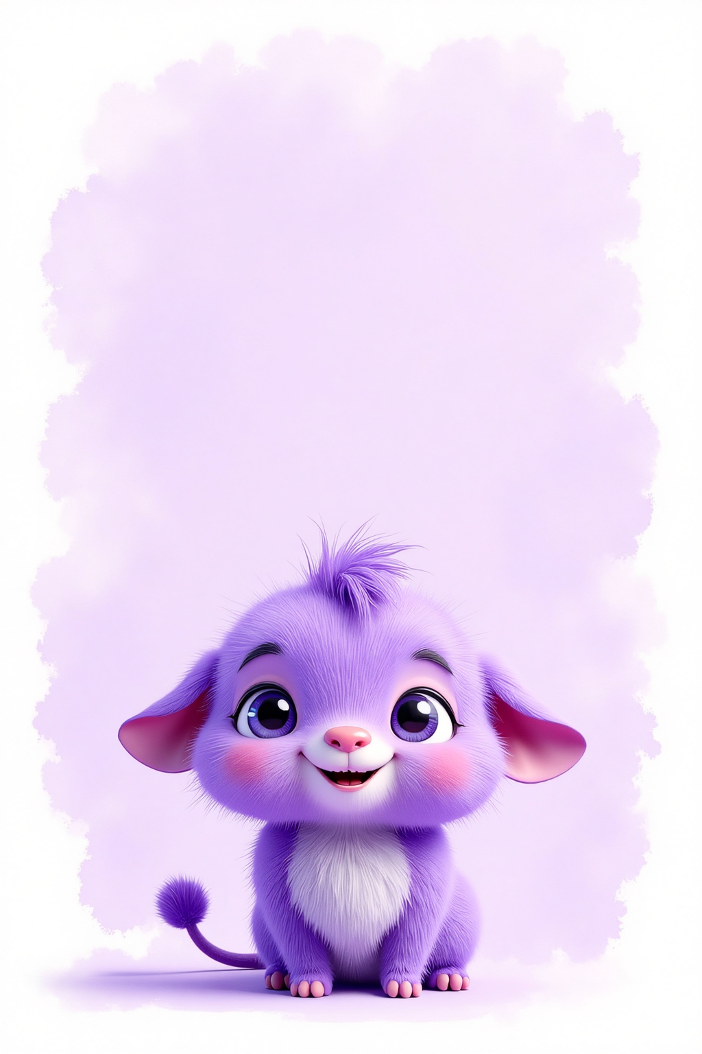 紫色のかわいらしいカートーン動物、3Dレンダリング、柔らかくふわふわした質感、パステルパープルの背景、大きな輝く目、明るい表情、シンプルで洗練された構図。