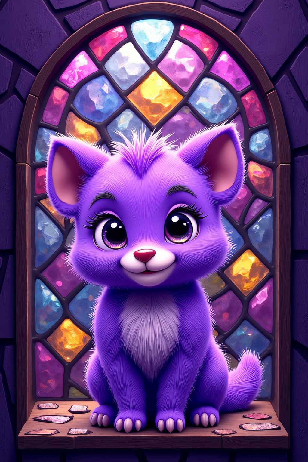 紫色のかわいらしいカートーン動物、ステンドグラススタイル、色とりどりの破片、光透過効果、パープルを主調とした色、複雑な模様、宗教芸術のインスピレーション。