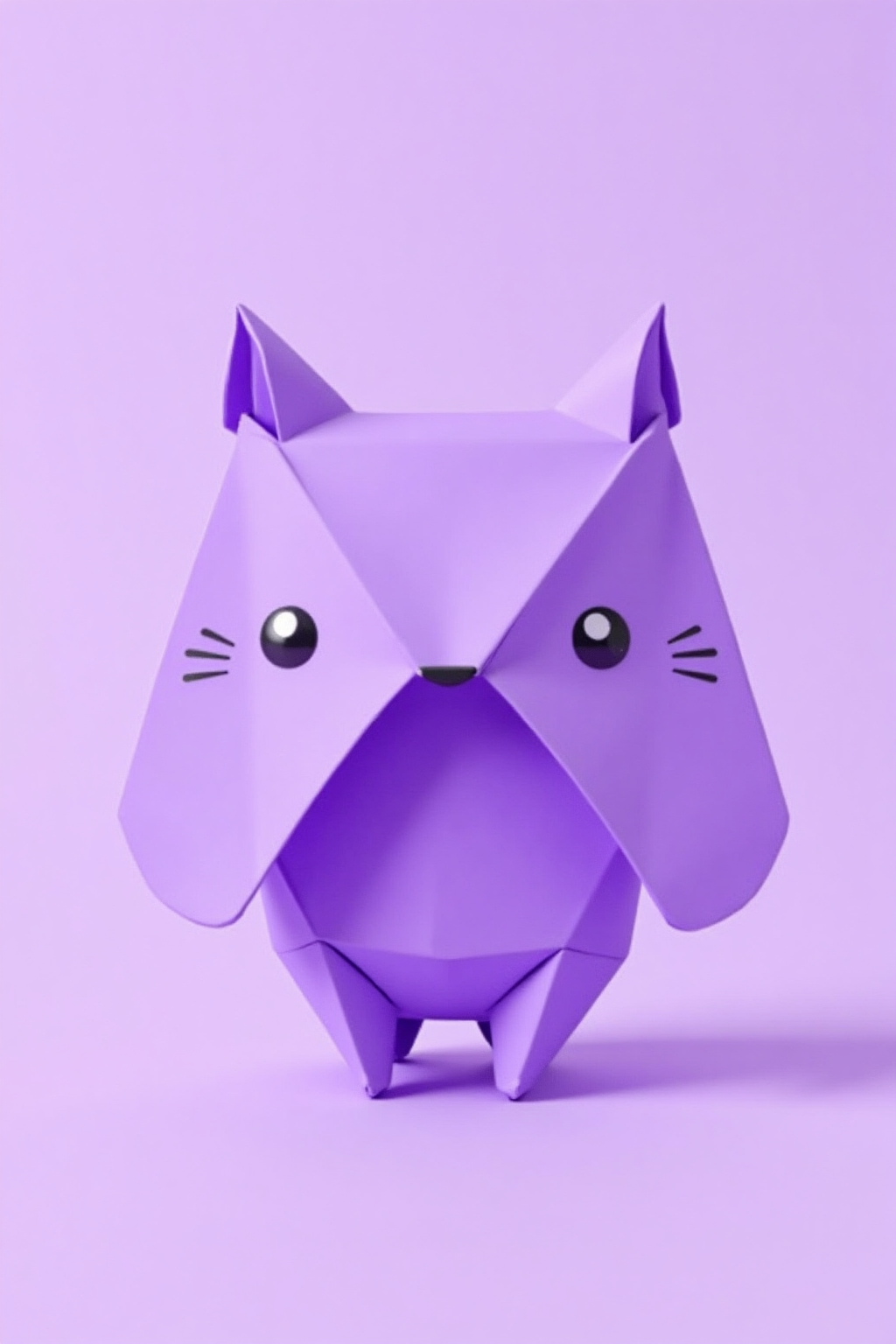 紫色のかわいらしいカートーン動物、折り紙アート、折った紙の形状、パステルパープルのトーン、ミニマリストデザイン、正確な折り目、洗練されたシンプルさ。