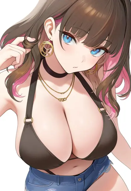 1girl, miwabelle, blue eyes, brown hair, colored inner hair, pink hair, gold earrings,