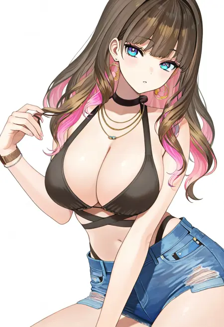 large breasts, necklace, choker, black bikini, highleg bikini, denim shorts