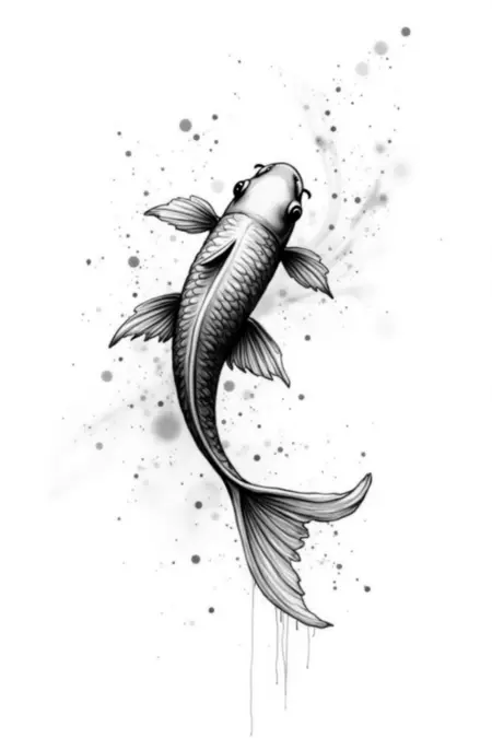 黒白のインク飛び散りスタイル、泳ぐ鯉を描く、流れる線、インクの垂れ、縁起の良い魚、静かな雰囲気、素朴な白地。
