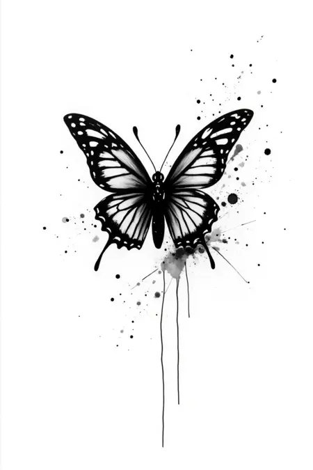 黒白のインク飛び散りスタイル、舞う蝶を描く、美しい羽、インクの飛び散り、色鮮やかな昆虫、軽やかな動き、白地。