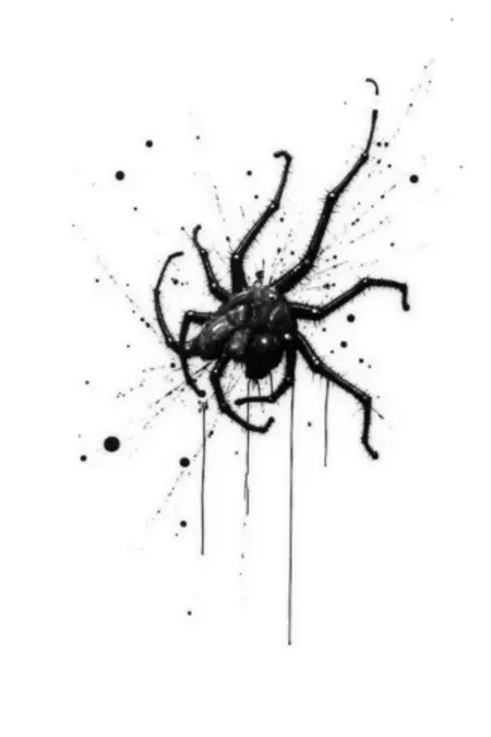 黒白のインク飛び散りスタイル、登るクモを描く、繊細なフォルム、インクの垂れ、小さな生物、ユニークな姿勢、白い背景。